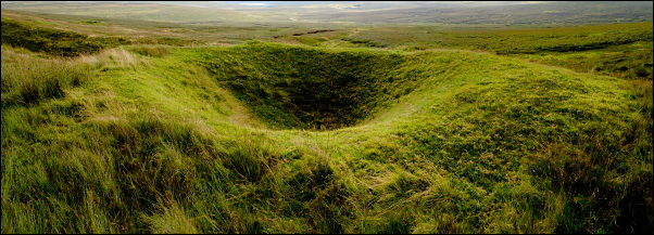 The ground was now getting very rough and wet. I headed up to an old ‘hush’ which is where the surface spoil was removed by a water dam which was filled then released to scour the surface to expose lead ore. It was huge and impressing and had old mine shafts on the north side. I was now on Calvert End and came to a rough track which I soon had to leave to head towards Round Hill and the junction of 3 walls. The weather was deteriorating and the rain became heavier. |