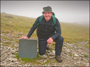 That way he would be walking at his own steady pace and not trying to keep up with me if I was going too fast. Adjacent to Comb Crags is an old ruined shepherds hut and we arranged to meet there. When I set off I could see Eric up ahead through the mist and by the time he reached the ruin I’d caught him up. We stopped to have our sandwiches and another drink. Although it was misty the temperature was still relatively warm so fluid loss could be a problem. There wasn’t a problem as I’d brought extra drinks with me. After our early lunch we carried on with the same arrangement. Eric set off and I followed about 5 minutes behind. When we reached the path from Nethermost Pike the cloud cleared briefly and we had a nice view across to Striding Edge but the clouds soon rolled back again. The summit wind shelter was almost in sight but before we got there we stopped briefly to have a look at the memorial stone to the first landing of an aeroplane on a British mountain in 1926. |