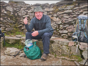 A few minutes on we were at the summit wind shelter. It is a short way below the actual summit but is a welcome stone structure where you can sit out of the wind. We sat next to a couple who had just arrived. We had a b it more food and drink and enjoyed the feeling of success even though the walk was far from over as we still had to get down. It was also 10 years to the day when we were both here to celebrate Eric’s 70th birthday. |