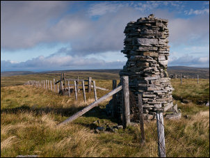 The fence line runs to the summit where a short way to the east is the trig post built on the top of a low stone pillar. An interesting fact about the short walk from the fence is that it took me from Cumbria into County Durham. I now needed to head north, following the line of the fence to the area called Nag’s Head on the map. That is where my main objective of the walk was. The map shows an ancient cross but I couldn’t find any information about it. It was about 2.5 miles away across rough and pathless moor. The fence ran generally straight but the County boundary didn’t. It took a wavy line route that straddled either side of the fence. Away in the distance I could see the tall cairn on the summit called Dead Stones. The going wasn’t too wet at all and some stretches had lines of wooden pallets set out to form a path above the peat. Apart from the decking there was no sign of a path but I did see the occasional boot print indicating that someone else had been this way. The cairn at Dead Stones was about 3m high. |