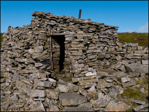 On the other side of the fence was a small stone hut with stone slates and a chimney. It was a delightful little structure with a tiny fireplace inside below the chimney. Someone had put some wood in and tried to light it. The wood was still there and only scorched round the edges indication that the fire was a failure. The door had long since gone but a stone wall in front kept the wind out. I continued north along the wire fence to Hag’s Head. Down to the left I could see the reservoir behind Perry’s Dam. At Nag’s Head the wire fence became a stone wall. |