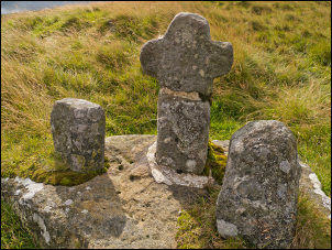 I followed it to the NE then left it to turn NW across open moor. There was no path of any kind as I headed for the co-ordinates of the cross that I’d taken from the map. I had no idea what to expect but as the ground began to fall away I saw a natural stone slab in front of me with a small stone cross and two small pillars either side. They were set into the flat rock and the small cross seemed to have been damaged and repaired. It was very eroded and didn’t have any marking to indicate its age.