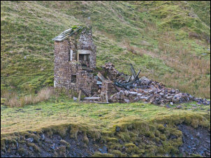 I crossed the wire fence and started my descent to the north. The ground was rough but not too bad as I was descending. The map shows a large area of Pine woods but they had been felled. I picked my way through the stumps to check out an old mine heading then followed the contour to Lamb’s Hill. I was soon following an old leat or waterway. It took me to an area of old mine workings with a ruined building by Wellhope Burn. One doorway and access steps were still standing. Across the river I walked up to an old track where there were a couple of wooden shooting huts. The track continued east through a large area of land that had been cleared of its trees. The path turnoff to Wellhope wasn’t marked and I overshot it before realising my mistake. I returned and took the path. It’s no wonder it wasn’t marked as there is no sign on the ground. |