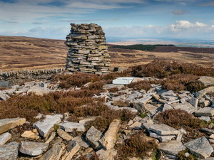 It was easy walking and the views were good, in spite of distant haze. The map showed me passing through the wonderfully named area of The Swangs but I couldn’t see anything that would justify the name. Just over the summit of Larchet Hill the track ends at a turning area with a hut in the corner. All the windows were covered and door locked. One reason I’d come this way was the map showed a chimney. There was no sign of one but a pile of stones and a carn in the middle. There was no sign of any evidence of mine workings so a chimney didn’t make sense. My continuing route was west, following the wire fence line. |