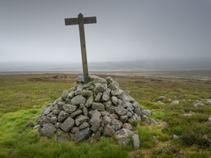 I turned right up the next lane and steeply op to Finney Hill. At the high point I was starting to reach the mist level. Near High Scotch Hall I turned left along a rough and muddy bridleway that headed out onto the moors. At the end of the walled track I went though a gate and out onto a very wet track. After a while I saw a cross on a pile of stones to my left. I investigated and found it to be Stobb Cross, which is marked on my map. The cross was wood and not very old. There was no indication what it signified. I returned to the path, crossed another and continued a mile to an improving track. |
