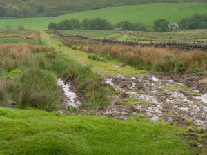 I headed off towards it in light rain, but at least I was just below the mist level. There are no paths of any kind around the trig post. I continued over Watson’s Pike to descent across rough ground to cross the path called ‘Broad Way’ continuing across more rough ground to the track called ‘Long Drag’ I headed north along it to gate where there was a ‘No Access’ sign. |