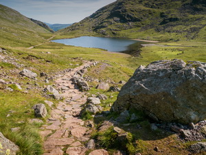 Higher up the lead was removed but a collar was then fitted which allowed Caroline to remotely administer an electric shock if he got too close to any sheep. Stockley Bridge looked idyllic in the sunshine with crystal clear water pools along Grains Gill below. Over the bridge and though the gate we set off up the steep path alongside Taylorgill Force. As we got higher a bit of cooling breeze came down from the higher fells. The valley opens out at Syhead Gill but the path is indistinct as far as the wooden footbridge. There it follows the west side of the gill and continues to Styhead Tarn. Behind the tarn was the Sty Head and behind that the route up via the Corridor path to Scafell Pike. Above the tarn is the Stretcher Box where we stopped to have something to eat and take in the views. |