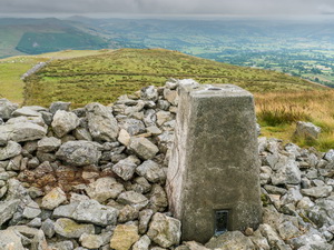 The path became horribly boggy where I left it and headed by a fence up the side Glan-hafon. There was no path and it was difficult at times. I was still in cloud near the summit but the ground had improved. The mountain has two summits shown on the map. The western one is 608m and the next slightly lower at 607m. The trig post is on the last and lowest summit. As I reached it the cloud began to lift and I had some nice views across the Tanat Valley. |
