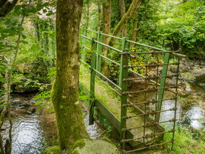 It was a lovely green track between deep bracken. A left branch I was hoping to take another path which was lost under deep undergrowth. I had to take a longer diversion to reach the path I wanted. I returned to the waterfall path and followed it to a metal bridge with interesting dragon motif gates. The waterfall looked very impressive but dark overcast rainy weather prevented me getting a decent photo. |
