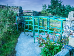 The main dam was breached with water running round the west side. But there was still quite a bit of water behind it. I found a faint path by Blea Beck which became a right of way at the next gate. I followed it across Hebden Moor where I went through a gate into the walled Blackstone Edge Lane. |