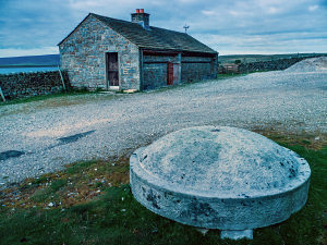 On the north side of the reservoir I left the track and headed north along another track running by a wall. A substantial shooting hut was at the start and nearby a few large circular capping stones, though no evidence of their original use. |