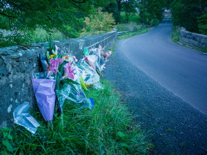 look at some bunched of memorial flowers and a police sign asking for