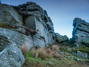 Across the reservoir was the impressive and distinctive Embsay Crag. At Crag Nook I crossed a wooden stile to walk a short way along the track to try and find another minor track heading north onto the moors. I reached the point shown on the map but there was no track to be seen. I headed over rough ground to climb up to the Deer Gallows rocky outcrop. |