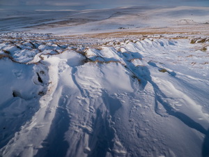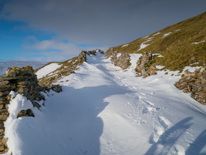 I left to the NW across pathless moor to the Windegg Mines area. The snow was thinner and the going easier as I descended Dry Gill and back to the road. It was then a short walk back to the car. |