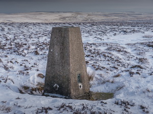I left the track and headed up towards Booze Moor. There was no sign of path so I had to cross the snowy hillside until I reached the track that heads across the moor. The going was still difficult as the snow wasn’t hard enough to take my weight and I kept breaking through. Eventually I reached the summit of Peat Moor Hill or Booze Moor and the trig post. |