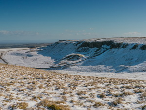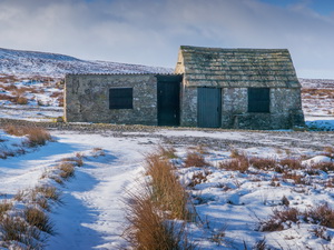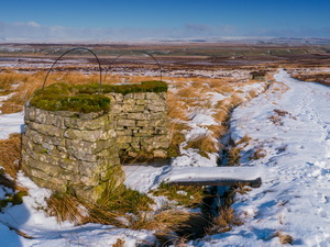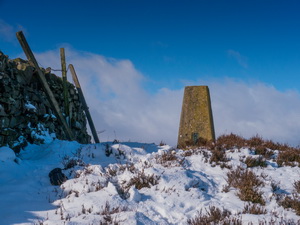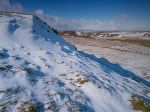 There snow on the ground making the going difficult at times. Through the gate it was easier walking and in the distance I could see the shooting hut that was one of my objectives. It was in good condition but unfortunately was securely locked. I find it frustrating that some are open and some aren’t. They are ideal shelter for walkers. My next objective was to reach the trig post at Citron Seat. For a while I was able to follow a snow track by shooting butts across Gilmonby Moor but above the 400m contour I was struggling through deep snow. |