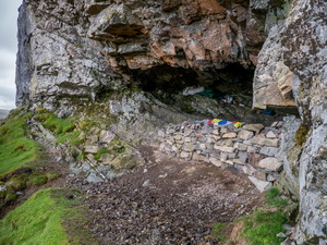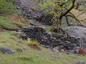 The front area had a low wall built and inside was old tins of food and various other items that could be of use to those needing shelter. I sat there to eat my sandwiches then returned down back to the cove. A good path took me up to the head of the cove where I was hit by the full blast of a strong westerly wind. |