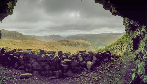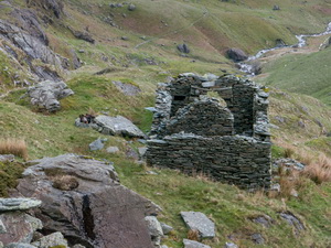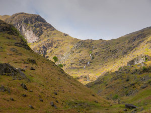 I continued steadily up Dovedale following an improving path that had some sections reinforced with rough stone steps. It was interesting to see a ruined building which was very substantial for a shepherds hut. I couldn’t see any sign of mine workings nearby. My objective was to re-visit the Priest’s Hole Cave on Dove Crag. It wasn’t visible from the Dale and even when I reached the hanging valley at the head of the dale there is no sign of it. |