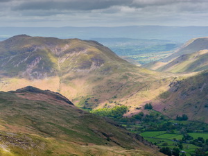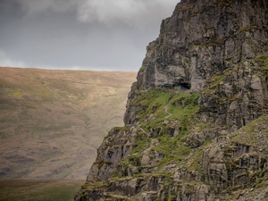I turned right to follow a stony route through rocks to Hart Crag then tuned right to head down towards Hartsop above How. In bad weather this can be difficult to find. The first part is quite steep and scrambly in placed but on Hoggill brow is pleasant walking. Looking back to Dove Crag iy is possible to see the Priest’s Hole Cave very clearly. |