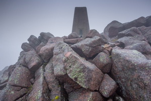 I followed it up past Couternach and above ladder Burn. Up a zigzag section onto the high Moor I reached the shooting butts. I left the vehicle track to follow a very well stoned pass which soon entered cloud. I continued to the summit of Mount Keen but couldn't see anything other than the track ahead. Before the summit was a boundary stone with a letter ‘B’ incised into it. |
