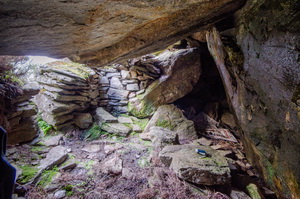 I then walked another mile west and up the Glen to the site of Balnamoon’s Cave which is mentioned on a guide board farther down the Glen. I spent about an hour trying to find the cave based on the information on the board. It turned out to the incorrect and I found the cave to the south east of the water fall and not south as indicated. The cave was used after the Jacobite defeat at Culloden. |