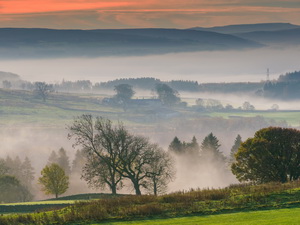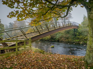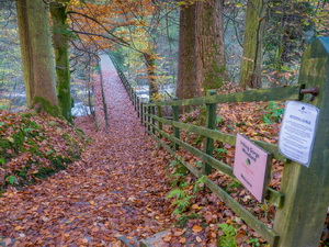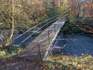 I left by a track heading up the hill to the NW then across a field to a tall wooden stile over a stone wall. On the top I stepped over but the misty weather had covered the slimy wooden step so my foot slipped off. I finished up falling and down the steps to land in the wet grass and mud on the far side. I was winded but unhurt. The path continued to the road where I turned left then right to a track to a large house up for sale. I minor path headed through the woods to descend to a footbridge across the River Irthing. |