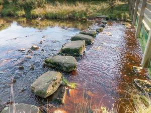 Over the wall the path soon joined a single track road where I turned left and after half a mile right to the isolated farm of Low Old Shields. Through the farmyard I followed the path through a field but the map shows it going through the adjacent field. I reached Tipalt Burn again where a set of stepping stones are called a ford. As I approached I was disappointed to see that a wooden footbridge had been constructed. |