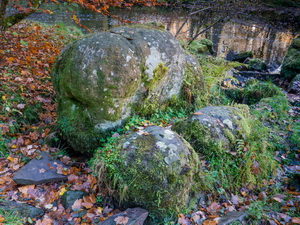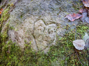 I saw a sign pointing to the Popping Stone but no indication how far it was. I checked the map and saw it wasn’t far so headed off to investigate. The path was slippery and muddy at first but improved further along. I didn’t know what I was looking for and soon reached a rounded stone covered in moss. It matched the location shown on the map and when I saw some carvings or graffiti on it reckoned I was at the right place. |