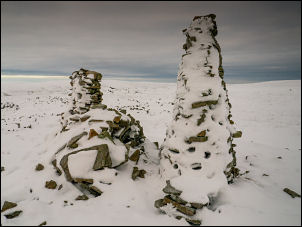 | I stopped at the old quarry building, which was roofless but gave me some shelter from the cold wind. The cloud was low but I had good views below it. The continuing rack vanished after a while and I had to cross deep snow across open moor summit of Fendrith Hill and the trig post. Away to the west or southwest I could see the distant hills of Cumbria. |