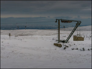 | They seemed to be doing better with the weather as it looked like sunshine was on the hills. I followed the boundary line fence which eventually became a wall and just to the north was the top post of the Ski-Tow which was working and although I only saw one skier as I walked by. |