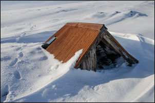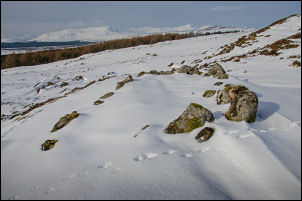 | I was following the route of a path shown on the map but there was little sign of it under the snow. By heading for vegetation outcrops I was able to avoid most of the deep snow and make slow progress. The going was tough but OK as long as I took it steady. As I passed Meall Ban I came to the remains of a hut roof in the snow. I couldn't tell if it had been blown off a hut or was meant to be a low level shelter. I continued across the valley to an area of old shielings but couldn’t see any sign of them under the snow. I headed up to a large plantation in the distance and eventually came to identifiable remains of some shielings. |