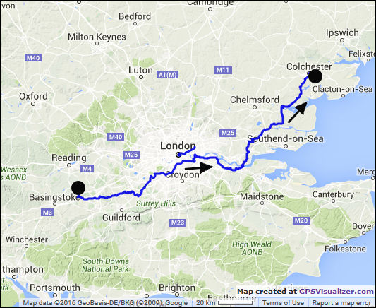 Hartley Wintney, Woking, Hampton Court, Greenwich, Gravesend ferry, Colchester, London, UK. Sun 24 Apr - Wed 27 Apr 2016