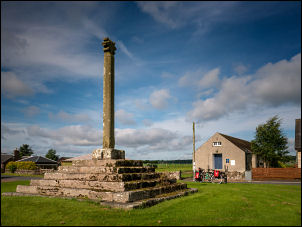 a village hall with adjacent green and tall stone cross. I stopped