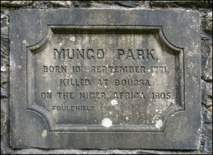 structure with a stone inset saying ‘ Mungo Park 1771 killed Boussa
