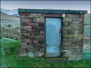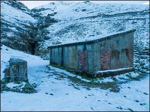 | I continued to cross the beck by a footbridge and then on the head of the valley where the main lead mine workings had been. The whole area was covered in snow so I wasn’t able to see much. A locked building seems to be connected with the lower building I saw earlier as there had been pipeline valve boxes on the way up the valley. |