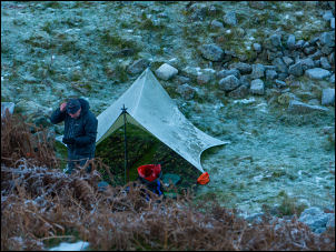 | I reached Hay Gill and the ruins of the old smelt mill. I looked down from the track to see several young ladies and nearby bivvy bags. On the opposite side of the track were several young men with similar bivvy bags by the sheepfold. They had all slept out overnight in the sub-zero temperatures. I noticed what looked like their instructor below. |