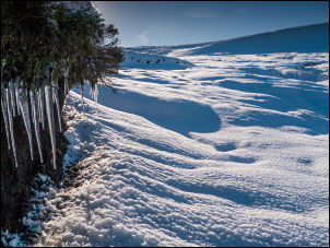 | I reached the top and was out on the sunlit and snow covered fell. I was looking forward to the rest of the walk but was soon disappointed. The snow looked nice but was horrible to walk over. It was about knee deep but the top crust wasn’t hard enough to take my weight. It wasn’t soft enough to wade through so I was constantly climbing up onto the crust then breaking through. |