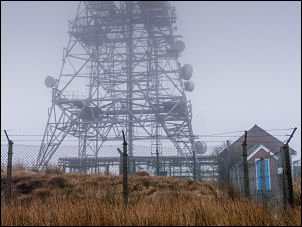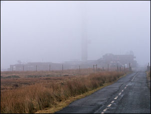 | Here I turn right then fairly soon turn left to follow the road up to Winter Hill transmitter mast. Part way up was an old abandoned bath which dog walkers have been using to dump in bagged dog excrement, absolutely disgusting. It was very misty and I couldn't see the mast at all until I was almost there at the base buildings. |