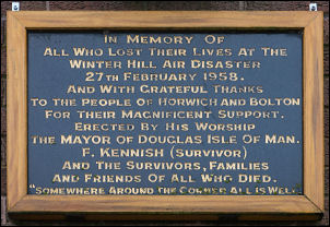 their lives at the Winter Hill Air Disaster 27th February 1958. And with grateful thanks to the people of Horwich and Bolton for their magnificent support. Erected by his worship the Mayor of Douglas isle of Man F. kennish (survivor) and the survisvors, families and friends of all who died. "Somewhere around the corner all is well" |