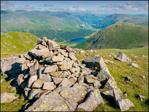 | They weren't the usual large ones normally seen. I continued steeply up and in places it was mildly technical. As I reached St Raven's Edge the views opened up and I could see south towards Windermere. Along the trail where many bags of large stones that have been helicopterd in. These will be used to improve the path. I continued upwards at an easy gradient following the wall on my left. |