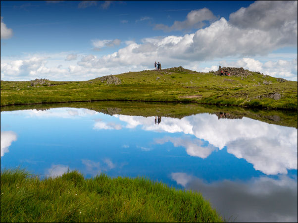 | There were a few other walkers around enjoying the sunny day. Just to the west of the cairn is a Red Screes Tarn which looked picturesque but closer inspection reveals dark and murky water. I was in no rush so wandered around taking photos before starting the steep descent back to Kirkstone Pass. It is a while since I've been on the track but it is a good descent, well-made and stoned in places. |