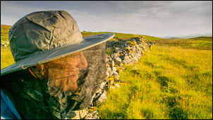 | I was on the main path up the mountain for a while but left it where a green track crossed it to head south. It was warming up so I stopped to take a layer off. I was immediately covered in midges so had to get my hat with protective net which kept them away. The track ended after about 1km and continued as a deer track. I was heading generally up the glen and wanted to get a bit closer to the river. It was easy going following the deer track and I came to a point looking down on some old shielings where there was evidence of ridge and furrow agriculture under the heather. I descended down to the ruins and followed a path by the river and continued upstream. |