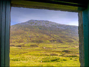 | The front door looked straight across to Schiehallion. My next objective was to investigate the area used for the 1774 south base line used in the survey of Schiehallion for Maskelyne’s pendulum deflection experiment to calculate the mass of the earth. I descended back to the river where there was a large area of flat ground which was the only area they could have used for a base line for the land survey. |