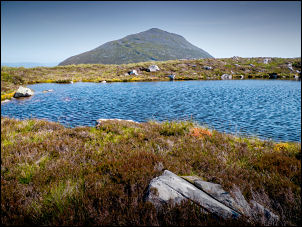 | Away in the distance I could see the Geal Charn Bothy and I passed several small tarns on the way to it. The outside is rather shambolic but inside the stonework is tidy with a hearth and chimney. There is also a track running up to it that ends outside the door. I followed the track down to the north for about 1km then left it to head south east towards Schiehallion. |