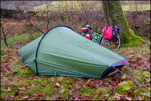 of sight of the road and pitched my tent. The rain was light but
