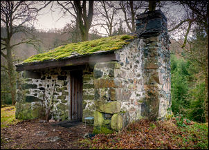 | At the road I turned left to head north along the road back towards my car but intending to check out the lower length of forestry road to see if the bothy was there. I met a man out walking from the caravan park at Bridge End Farm. He said he’d seen film crews presumably with news teams about the Thirlmere zip wire proposals. He continued and I headed up the forestry track and soon came to the bothy also known as Countess Ossalinsky's Summer House. |