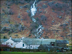 | The plotted route I was following showed a descent of Sourmilk Gill waterfalls to the north side. It was extremely steep and there was no sign of a track. I managed to cross the river and join the main tourist path on the south side. The stoned steps descended steeply but some sections had been washed away meaning a steep scramble down the rocks. I reached the valley bottom and as I walked through the farmyard, saw the farmer again and exchanged a few words as I returned to my car. |