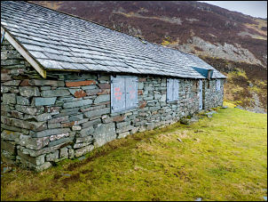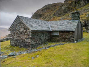 | I climbed steeply up to the Mountaineering Hut. It was exactly the same as 10 years ago, in excellent external condition but securely locked with all windows and door covered in steel shutters. It was still windy so I sat by the wall and had my butties. Above the hut was a succession of spoil heaps and ruined buildings. At the top was what looked like some pulley winding gear. There were still some snowfields on the hillside so I climbed above them to reach the fell top at the fence. |