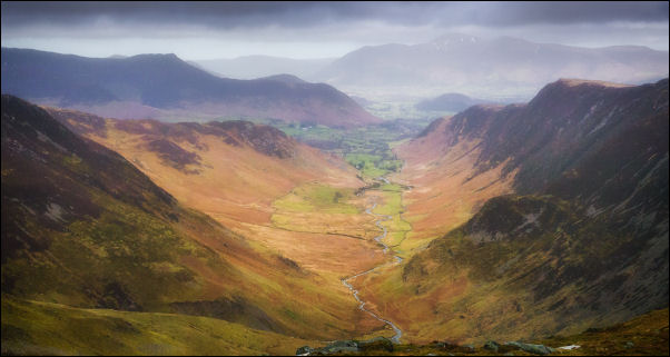 | I stopped for a while to take in the view north of Castle Crag and Borrowdale. It looked spectacular even in the gloomy weather. The descent path to the next track was very wet and slippery so I walked on the grass and ferns wherever possible. At the main track I turned right for a while then up an indistinct track to the left heading for the old Rigghead Quarries. |