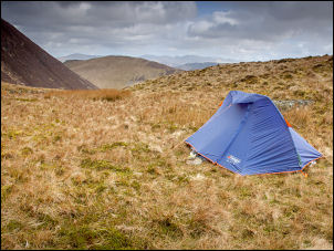 | This is where I’d camped on Thu 13th Apr 2006 while back-packing from Keswick to Coniston. The location of my old camp was excellent as the ground was flat and dry and nearby a spring issued crystal clear water. I was hoping this may be somewhere to camp in the future but there was no phone signal of any kind. When I was here last I left the valley by climbing up the ridge to the west. However I wanted to check if there was water high up the valley and possibly a signal so I continued climbing past an old sheepfold and up the very steep scree sides. Although I found a small spring there was nowhere to pitch a tent and still no signal. I reached the main path at the top and followed it to Wandope summit where there is a small cairn. |